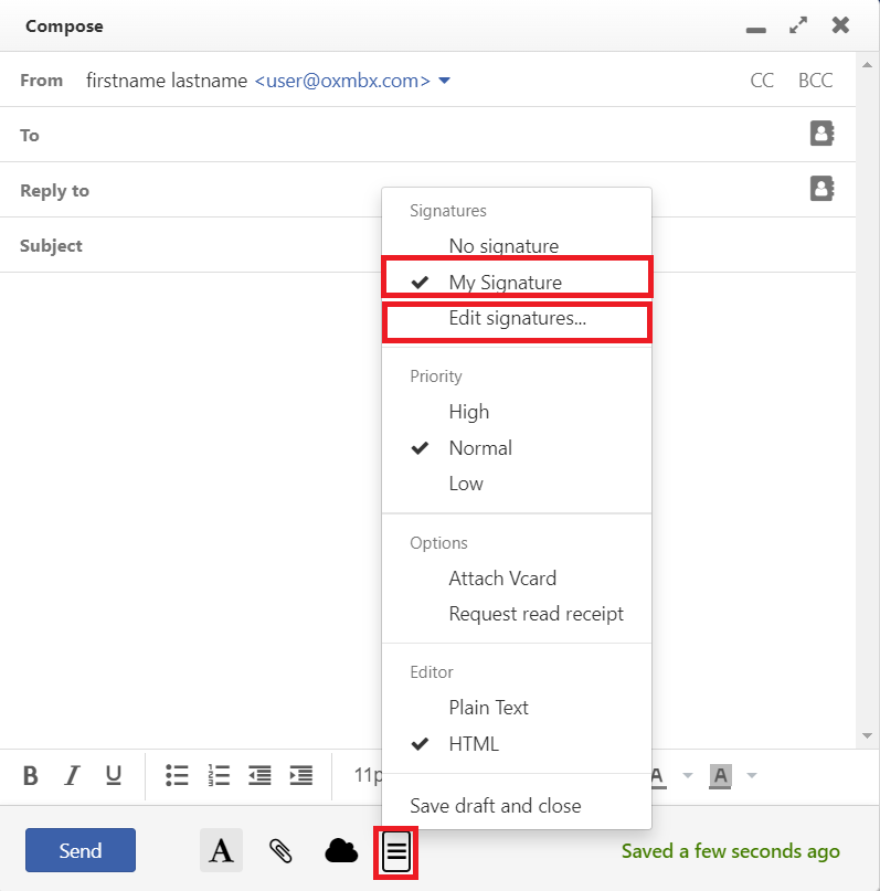- Select a signature from the list. If you do not have one created yet,click on Edit signatures...