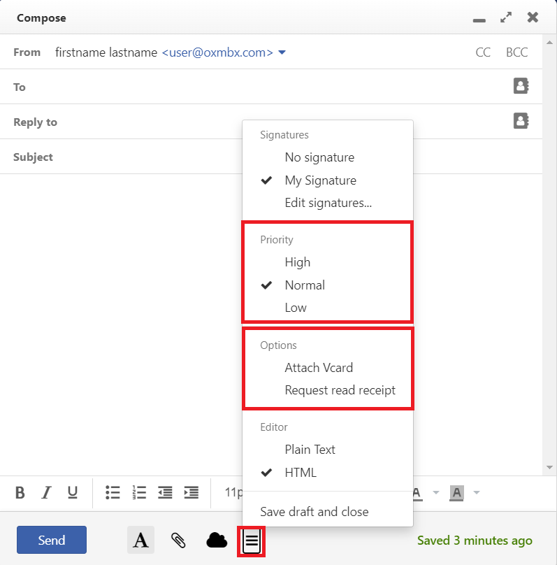 - In order to compose the E-Mail in HTML format, select Options and choose HTML. A formatting bar appears.