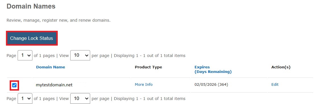 3.1. Alternatively, select the domain checkbox you wish to manage, and click on the Change Lock Status button.