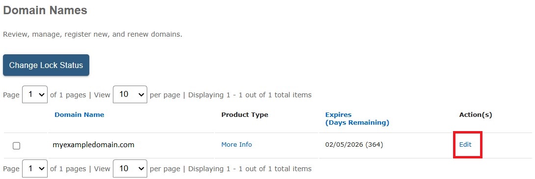 3. The Domain Names page will show a list of your active domain names. Click Edit next to the appropriate domain name.