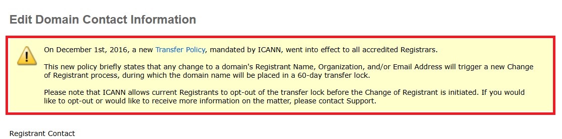 Important: If you update the registrant contact, the domain name will be locked for registrar transfer for the next 60 days. If you are planning a change on your registrant contact please review the process in details first.