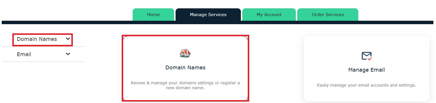 and select the Domain Names icon, or click on the Domain Names menu (located on the left side).