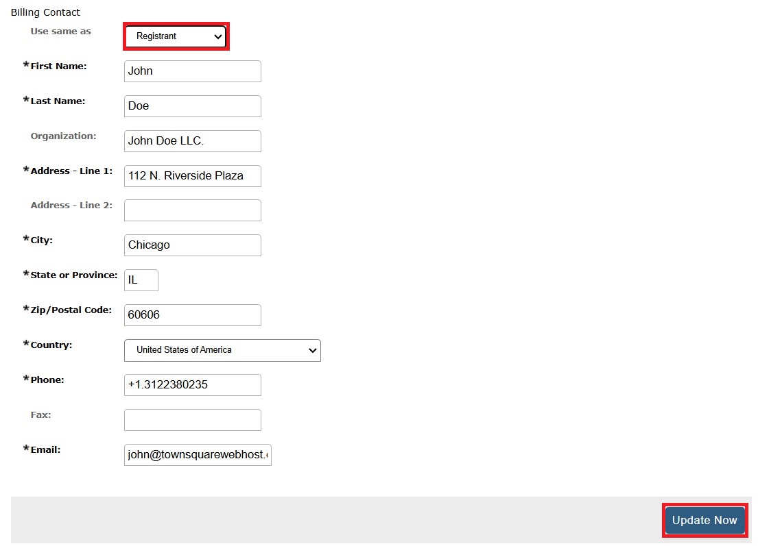 4. Enter the updated contact information in the Registrant Contact section and click Update Now.
